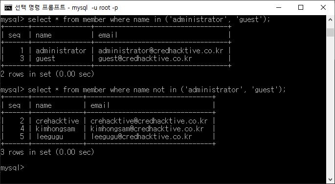 예제 : select * from member where seq != 3; 을 입력하면 seq가 3이 아닌 레코드가 출력