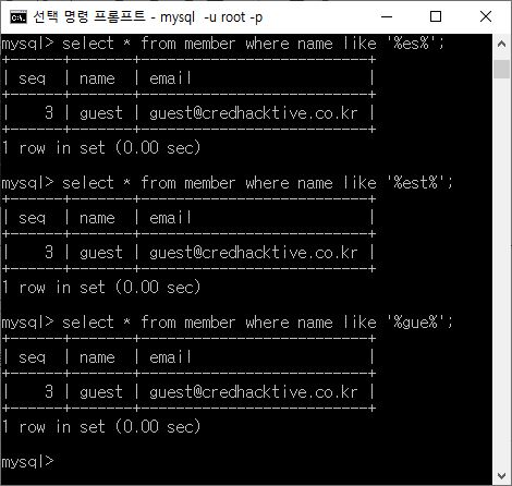 예제 : select * from member where name='gue' 'st'; 을 입력하면 이름이 guset인 레코드가 출력